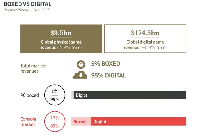 Αυτό από μόνο του είναι ανησυχητικό, έχουμε όμως από δίπλα και το άρθρο του GamesIndustry.biz στο οποίο τα νούμερα από αυτή την κόντρα δείχνουν ξεκάθαρα ότι τελικά είμαστε πολύ λίγοι αυτοί που αγοράζουμε πλέον δισκάκια. Ενδεικτικά θα αναφέρω ότι από τις πηγές του site βλέπουμε ότι στο PC οι digital αγορές είναι το 99% των συνολικών αγορών videogames, με το 1% να είναι τα φυσικά αντίτυπα. Στις κονσόλες -που μέχρι κάποια χρόνια πριν κρατούσε λίγο το πράγμα- τώρα έχουμε φτάσει σε ποσοστά 87% τα digital, και 13% τα φυσικά games.